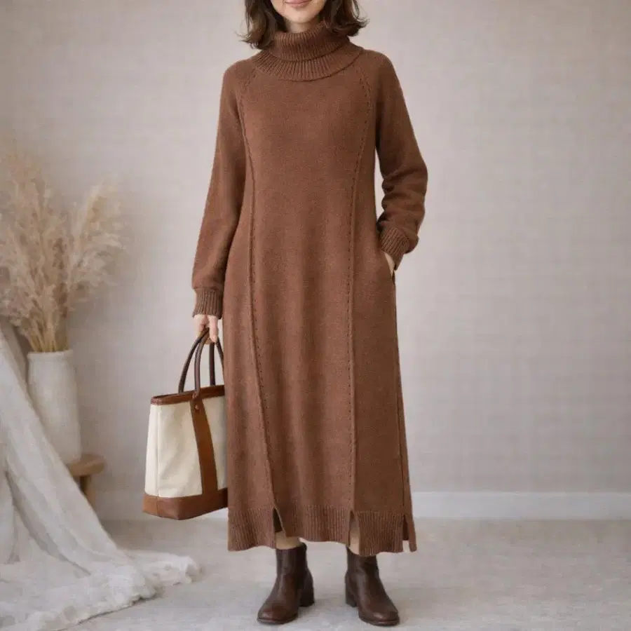 바브 [F] 성인 내추럴 뽕긋 소매 사이드 슬릿 터틀넥 니트 원피스