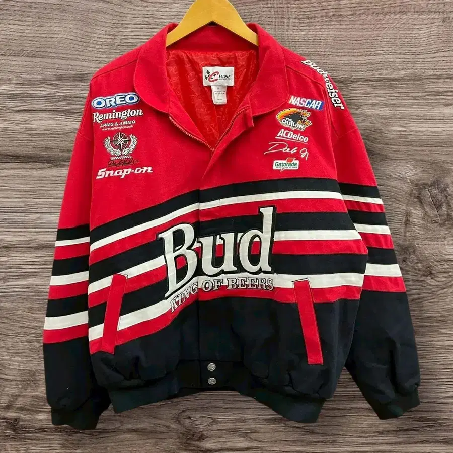 NASCAR 공식 레이싱 자켓입니다. 버드와이저를 메인 스폰서로 한 풍부한 와펜이 눈길을 끄는 아이템입니다. Dale Earnhardt Jr.(데일 아른하트 Jr.)의 사인 포함으로 소장 가치도 뛰어납니다. 레드 x 블랙의 박력 있는 컬러링이 아메리칸 모터스포츠의 열기를 느끼게 합니다. 모터스포츠 팬은 물론, 스트릿 패션으로도 존재감 있는 아이템입니다.