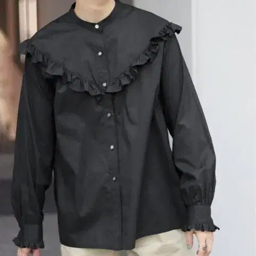 자동 번역되었어요. 원문보기프릴 디자인의 블랙 긴팔 셔츠, 스탠드 카라.