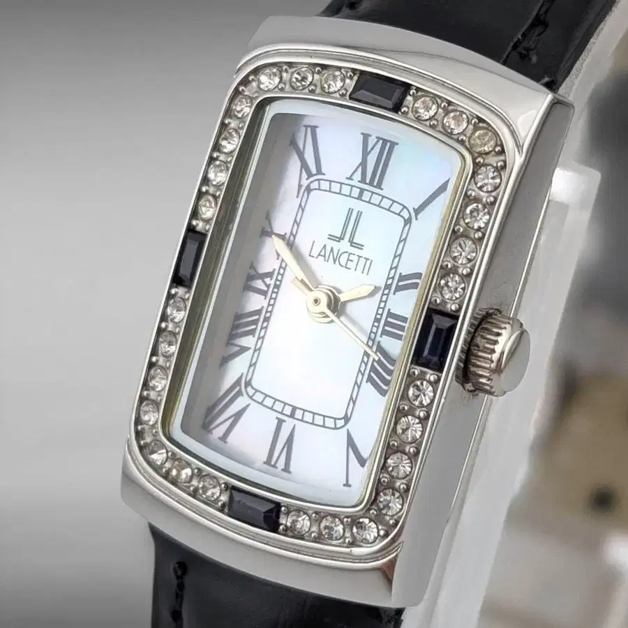 [ 새 배터리/벨트 작동 ] LANCETTI 란체티 LT-6052 화이트 쉘 다이아 베젤 스퀘어 박스 포함 손목시계 여성용