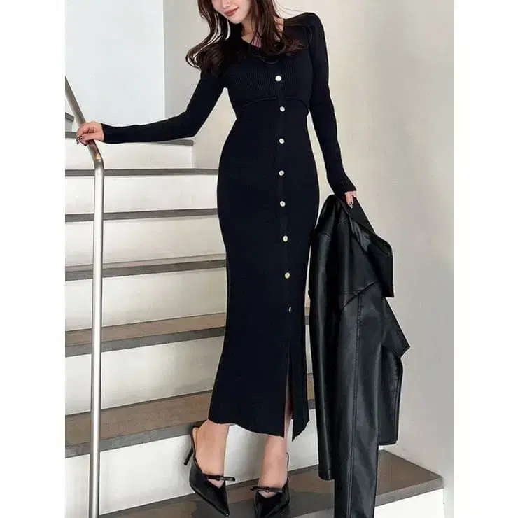 [ 새상품 택 포함 ] 리젝시 골드 버튼 타이트 니트 원피스 블랙