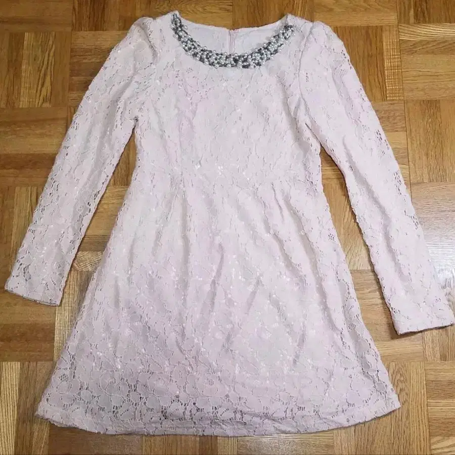 레이스 핑크 긴팔 무릎 기장 원피스 펄 비즈 포함