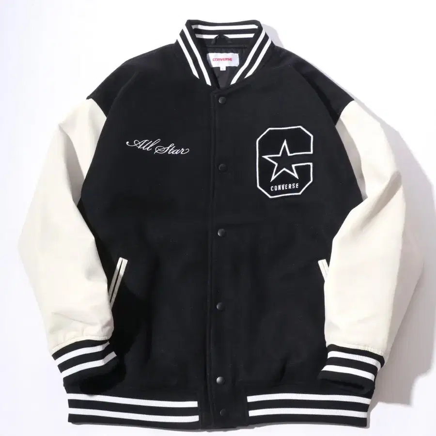 자동 번역되었어요. 원문보기CONVERSE의 All Star 바시티 자켓, 블랙과 화이트의 배색으로 자수 로고가 특징입니다.