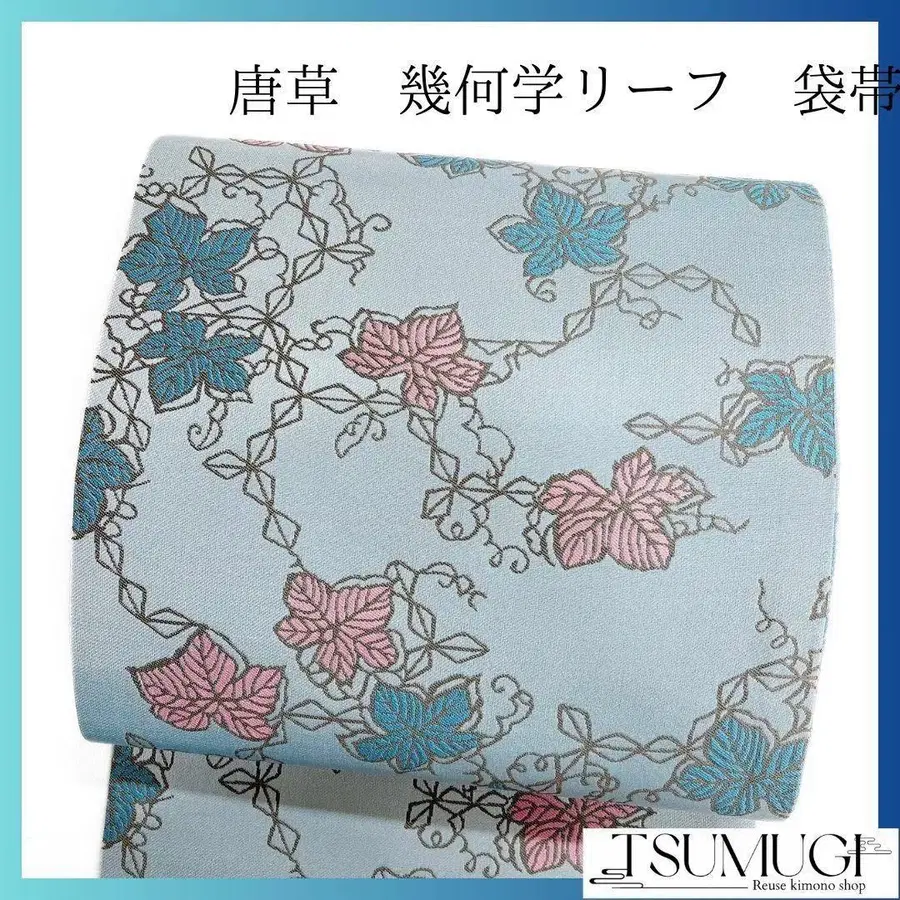 당초 무늬와 기하학 패턴의 리프가 짜인 후쿠로 오비입니다.