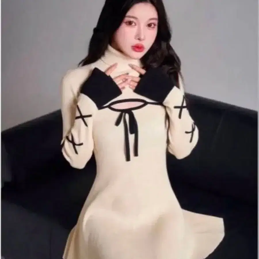 Darich 바이컬러 리본 디자인 니트 미니 원피스