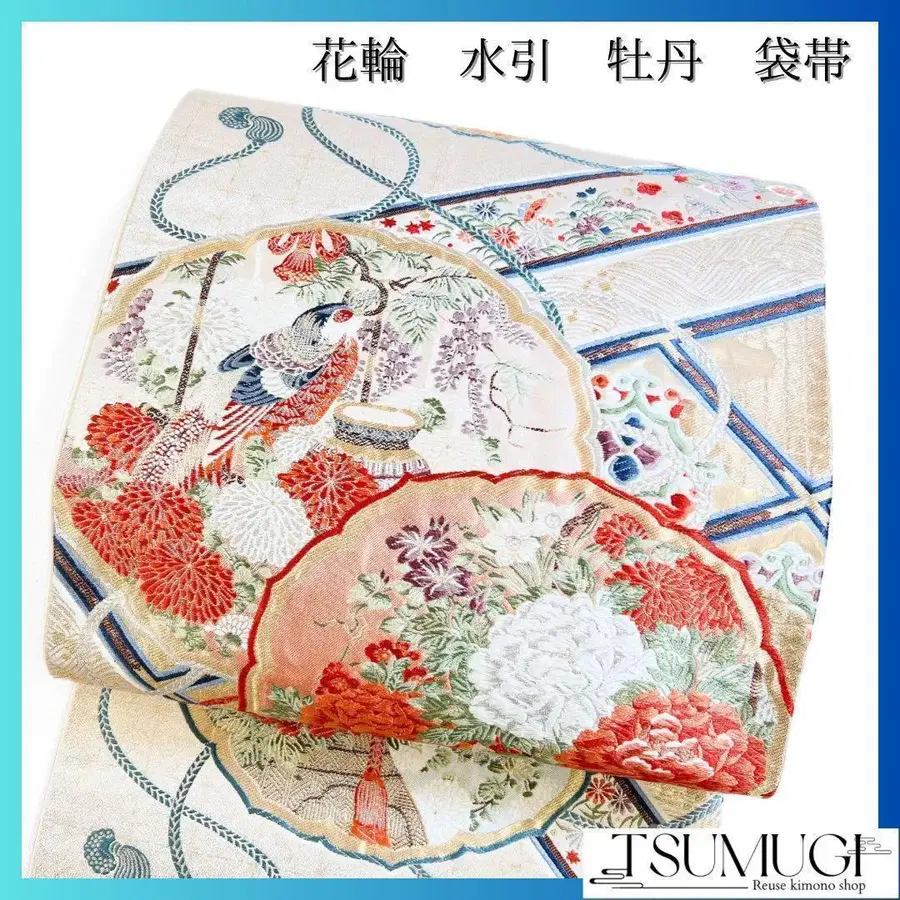 • 후쿠로 오비 금실 학 문양 매화 소나무 부채 문양 기모노 101t