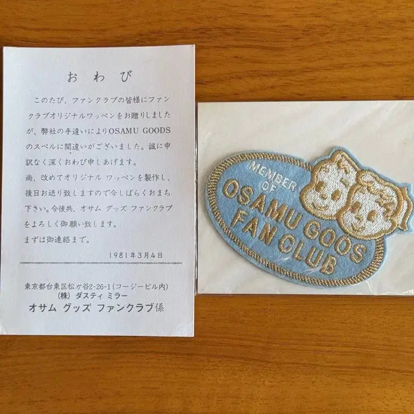 OSAMU GOODS FAN CLUB 멤버 와펜 오타