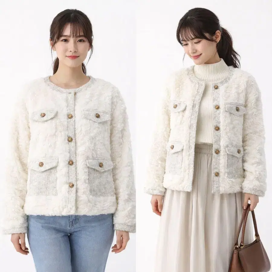 LAC-VERT 보아 자켓 화이트 트위드 테두리 골드 버튼 FREE