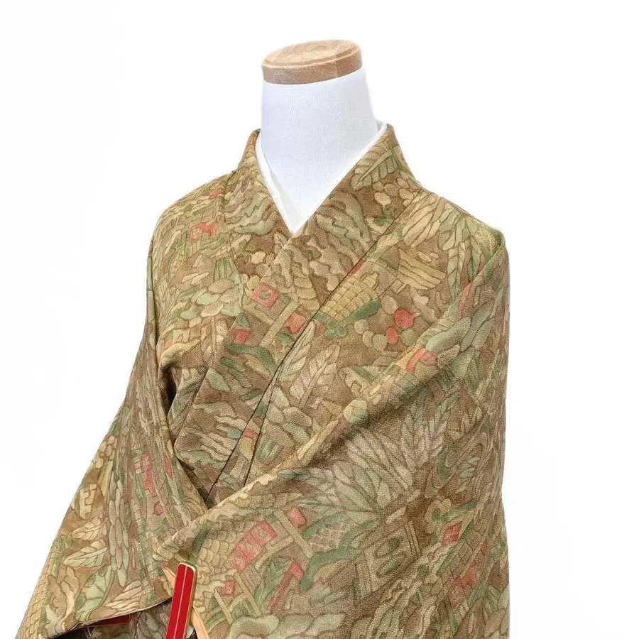 코몬 브라운 거리 풍경 나무 무늬 리프 기모노 072t
