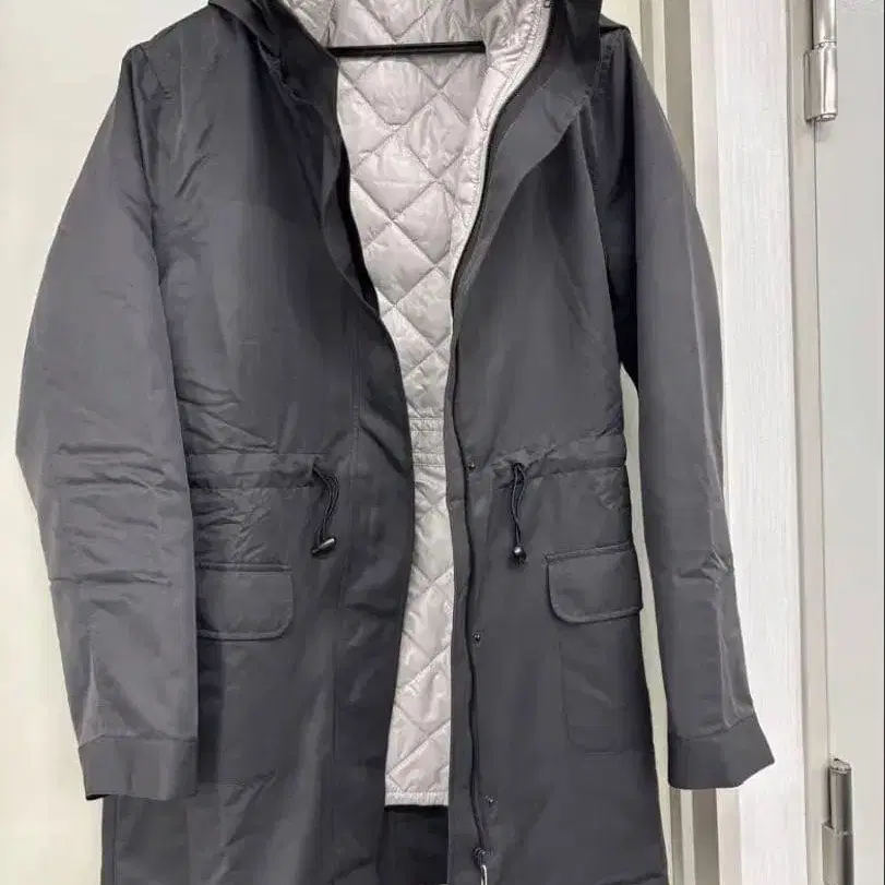 비쓰리 후드 부착 그레이 롱 다운 자켓