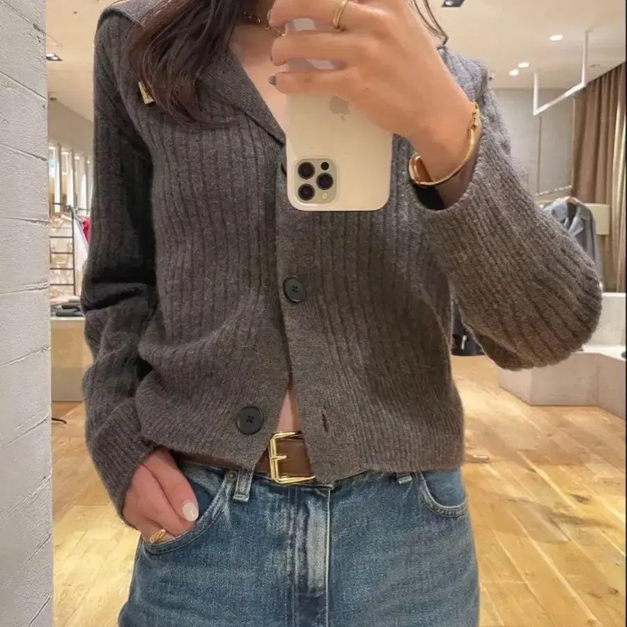 리브 편직이 고급스러운 그레이 색상의 긴팔 가디건입니다.