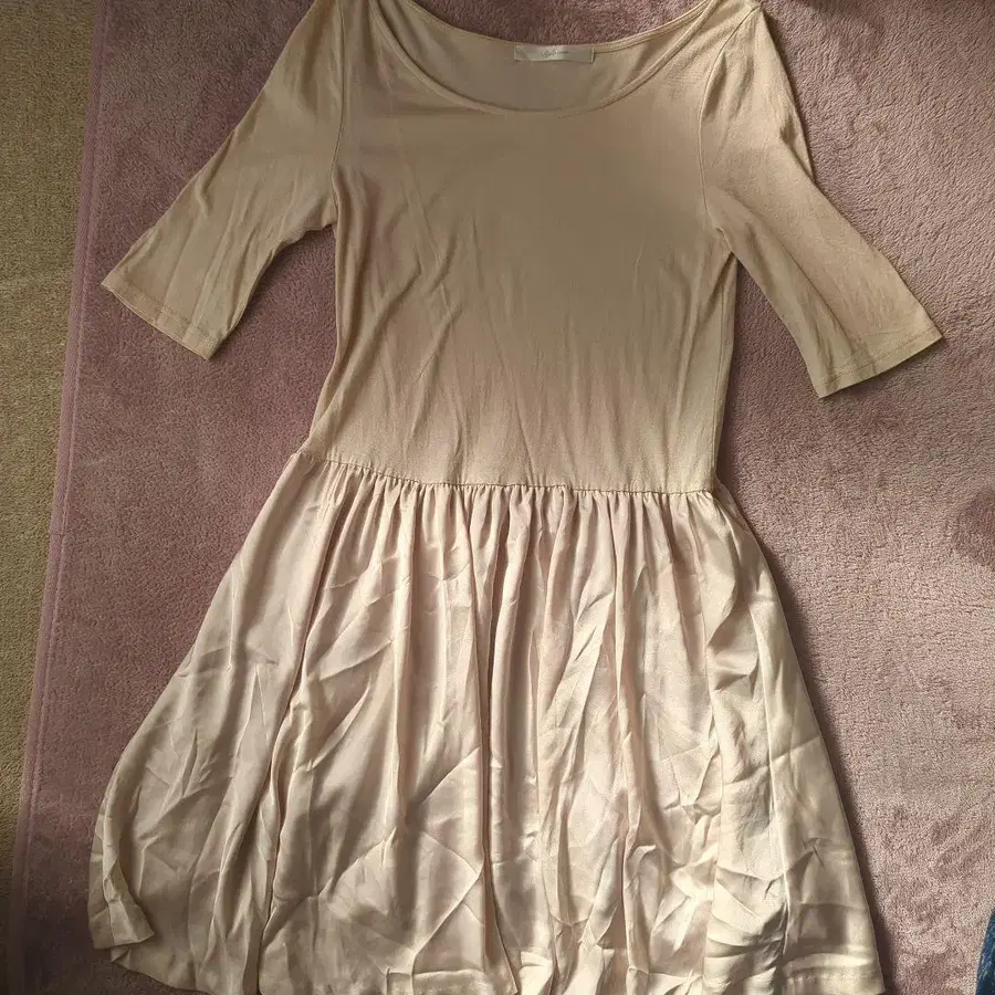 스타일닷컴 베이지 반팔 A라인 미니 원피스