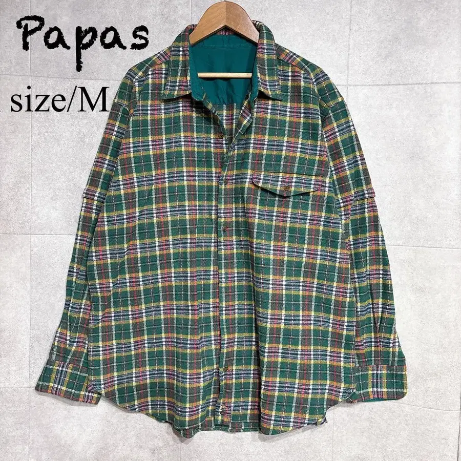 녹색 계열 체크 무늬 버튼 다운 셔츠, 가슴 포켓 부착.