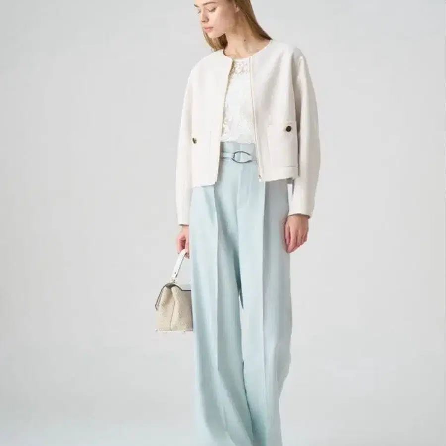 턱부터 이어지는 센터 프레스가 들어간 하이웨스트 와이드 팬츠입니다. 타원형 메탈 부품의 얇은 벨트가 포인트입니다.