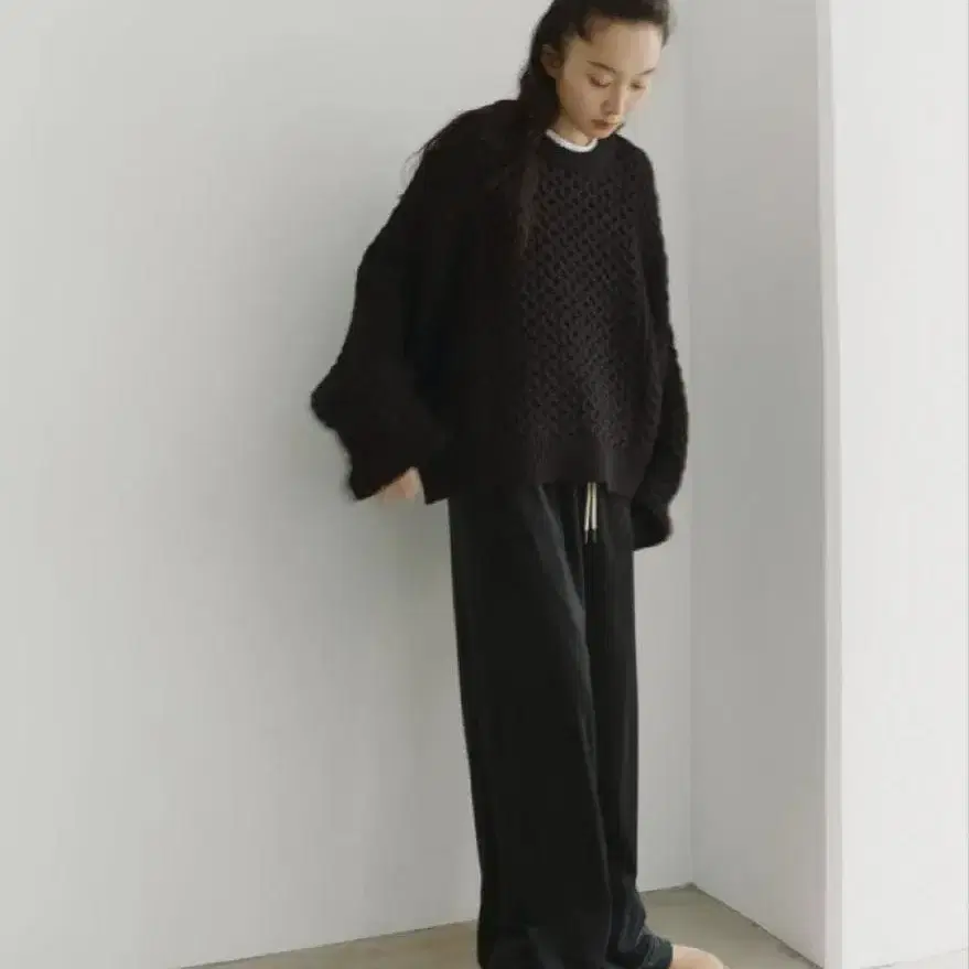오버사이즈 블랙 니트 스웨터, 뜨개질 디자인이 특징.