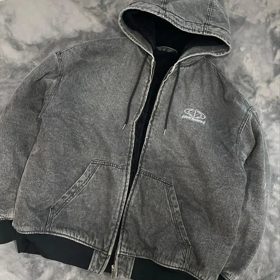 그레이 데님풍 후드 부착 후드티 보아