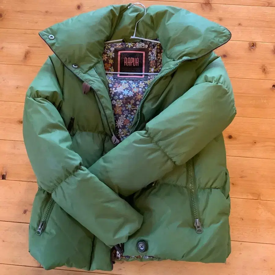 깨끗한 그린 색상의 다운 자켓 소매 리브 부분 침수 얼룩 있음