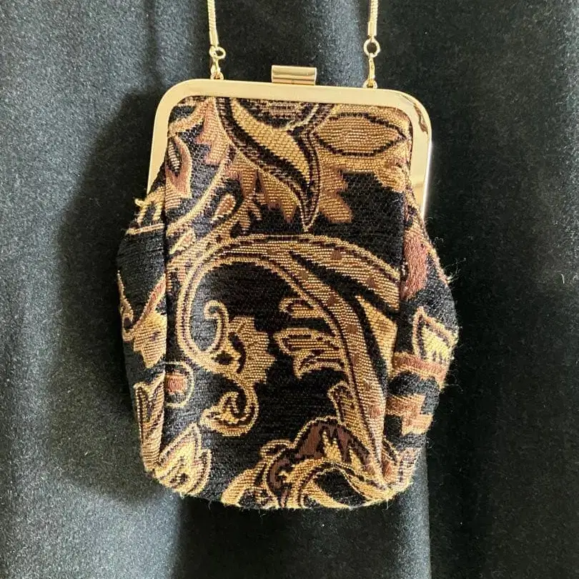 고블린 직조 페이즐리 무늬 패브릭 소재 숄더백, 골드 컬러 프레임 포함. - 디자인: 페이즐리 무늬 패브릭 소재 숄더백 - 컬러: 블랙과 골드 컬러 조합 - 소재: 원단 - 스타일: 클러치 스타일 - 금장 장식: 골드 컬러 프레임과 체인 - 사이즈: 소형 세로: 약 19.5cm, 가로: 약 14.5cm, 폭 약 5cm 체인 길이: 약 108cm 뒷면에 작은 포켓이 있습니다. 방문해 주셔서 감사합니다. 3~4년 전에 어패럴 샵에서 첫눈에 반해 구매했지만, 2~3회 정도밖에 사용하지 않아 큰 마음먹고 판매합니다. 사진 9번째의 표시된 부분만 약간의 올풀림이 있었습니다. 사이즈는 개인 측정으로, 참고용으로 봐주세요. 올풀림이 있었으므로, 상황에 따라 가격 인하도 검토하겠습니다. 상담해주세요. 체인과 금장 장식 부분은 깨끗합니다. 체인과 백은 탈부착이 가능합니다. 색감은 5, 6번째 사진이 비슷합니다. 상당히 선명합니다. 백 안쪽도 깨끗합니다.
