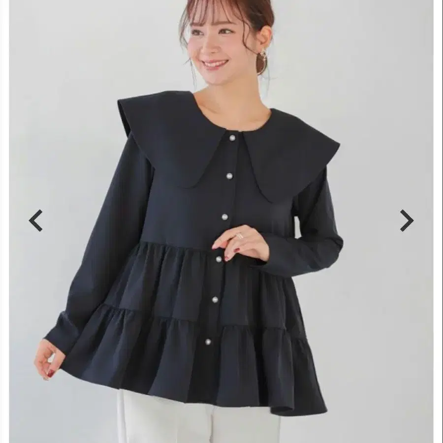 핏모어. 백리본 칼라 펄 버튼 페플럼 블라우스. 네이비