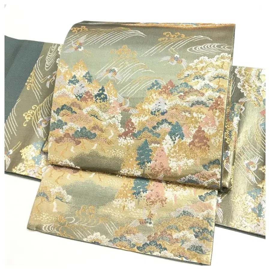 순수 실크 락 오비 후쿠로 오비 그린 금채 이부식 이중 북 츠쿠리 오비