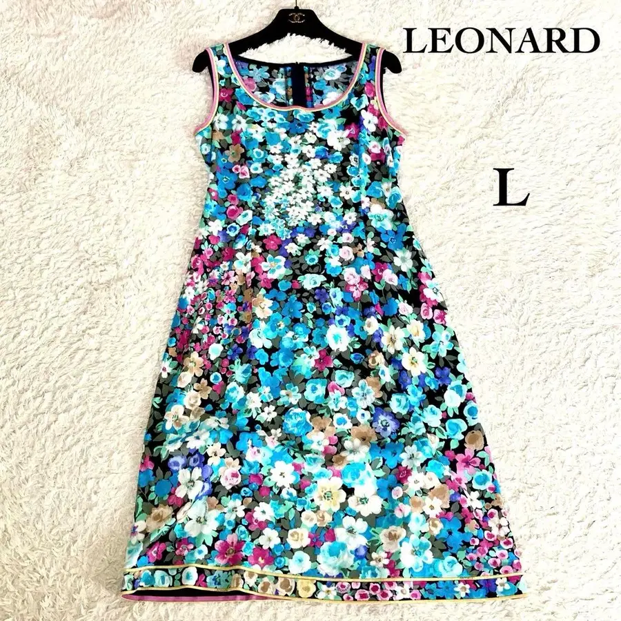 [컨디션 최상] 레오나르 보타니컬 플라워 트림 A라인 원피스 블루