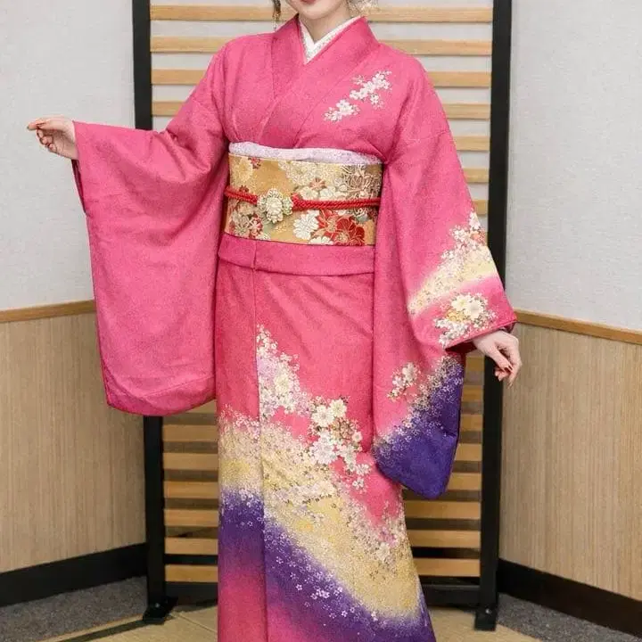 기모노 야마토 후리소데 핑크 보라색 꽃무늬 자수