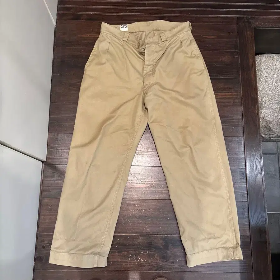 50년대부터 60년대 무렵의 프랑스군 M52 치노 트라우저입니다. 탄탄한 두꺼운 코튼 치노를 사용했습니다. 프론트는 버튼 플라이이며 허리에 2개의 턱이 들어갑니다. 허리 부분부터 허벅지까지 여유로운 실루엣이며, 테이퍼드 처리로 깔끔한 인상을 줍니다. 마찰 등의 약간의 사용감은 있지만, 특별히 눈에 띄는 데미지 없이 양호합니다. 표기 사이즈는 35이며, [3]은 길이, [5]는 허리 사이즈를 나타냅니다. 인치로는 W35~36 상당입니다.