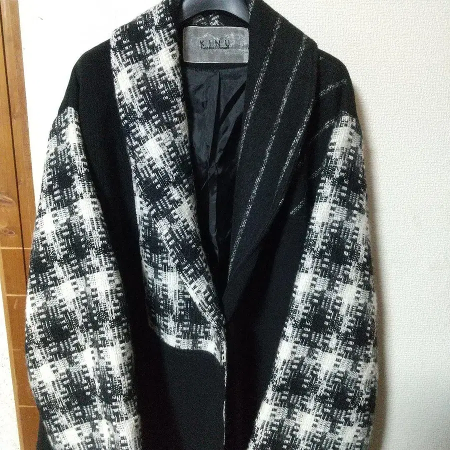 안티카 KINU 블랙과 화이트 체크 무늬 롱 코트