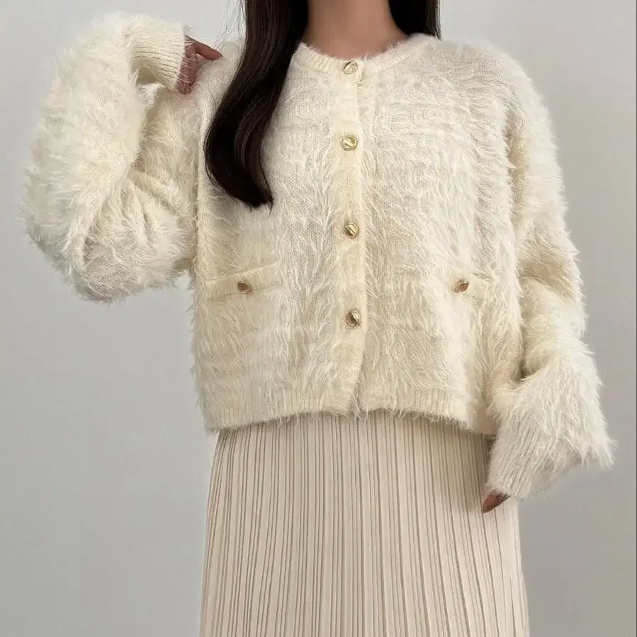셋업 (얇은 소재) 골드 버튼 샤기 니트 가디건 + 플리츠 스커트 set