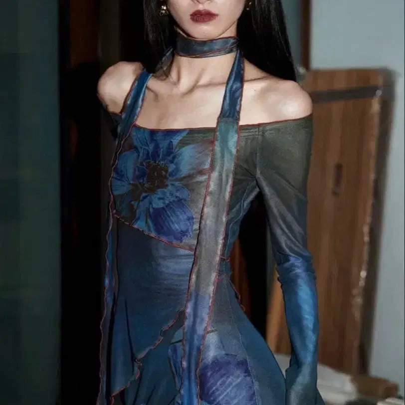 택 포함 새상품 플라워 프린트 오프숄더 튤 드레스 S