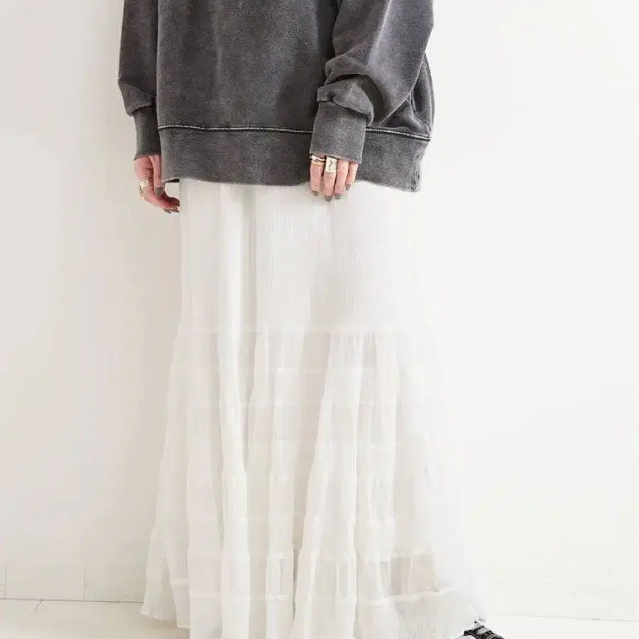 밑단 절개에 코튼 소재의 메쉬 원단을 사용하고, 이 소재를 조합하여 티어드 절개를 넣은 디자인성이 뛰어난 스커트입니다. 가벼운 느낌의 맥시 길이로, 봄부터 여름까지 활약해 줄 아이템입니다. 드라이클리닝으로 관리 가능합니다.