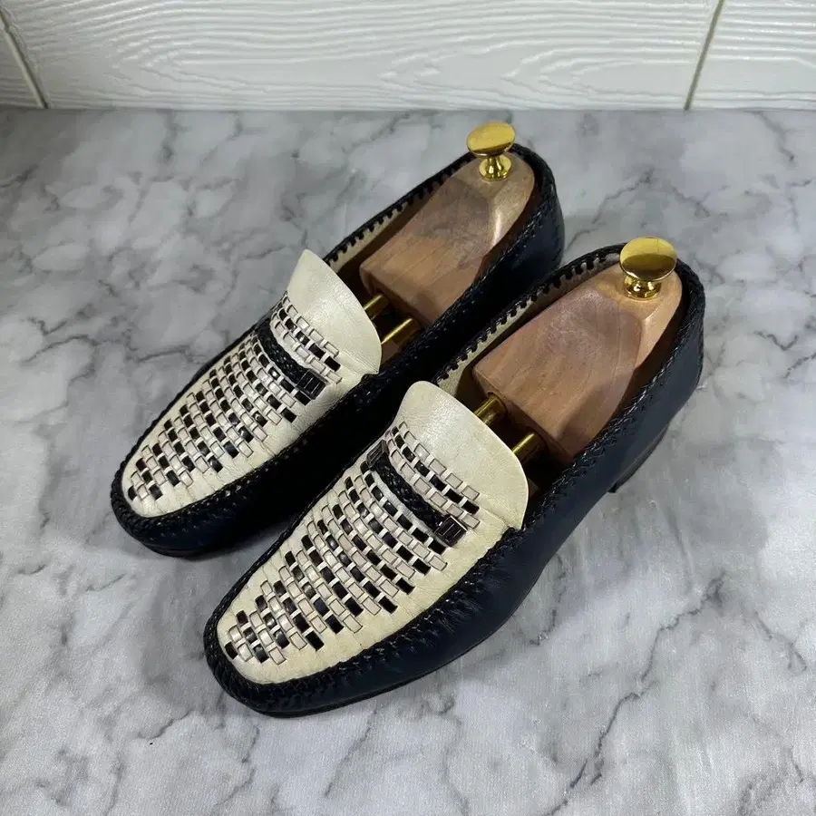 마레리 네이비와 화이트의 뜨개질 가죽 로퍼 24.5cm