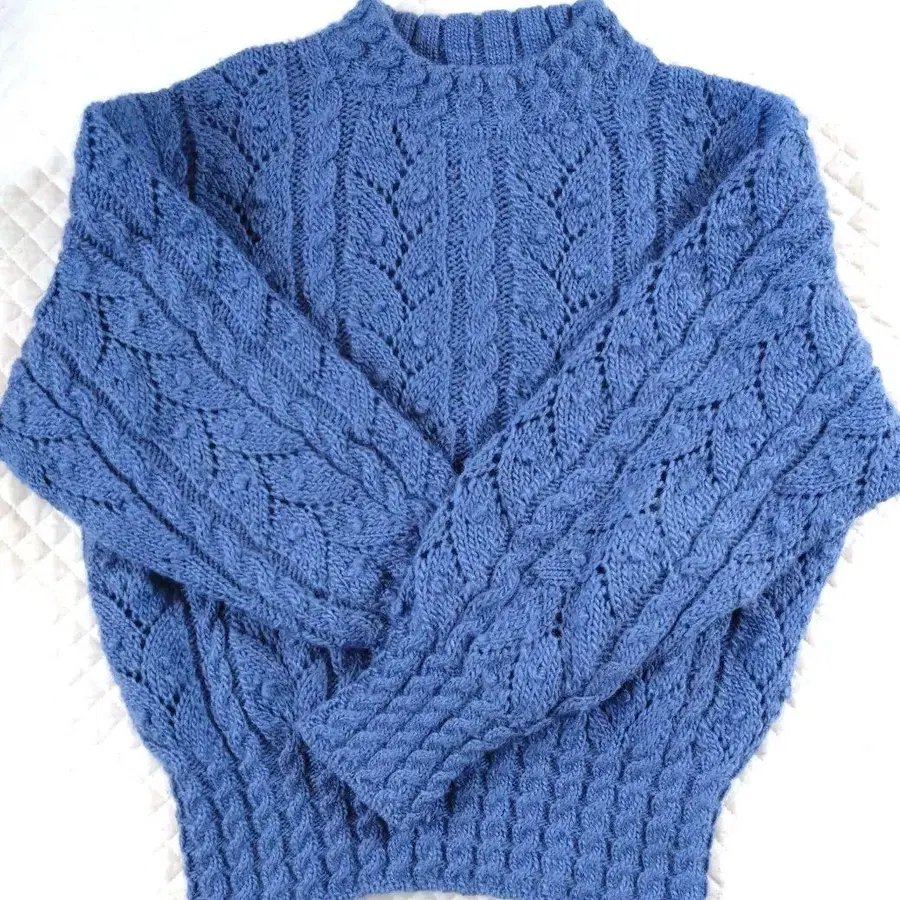 핸드메이드 파란색 케이블 짜임과 시스루 짜임의 긴팔 니트 스웨터