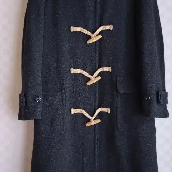자동 번역되었어요. 원문보기울 혼방 소재의 블랙 더플 코트, 후드 부착 및 토글 버튼 디자인.