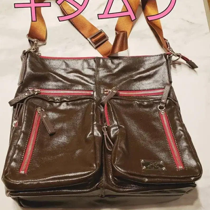 브라운 합성 피혁제 숄더백, 빨간색 지퍼가 달린 스타일리시한 디자인.
