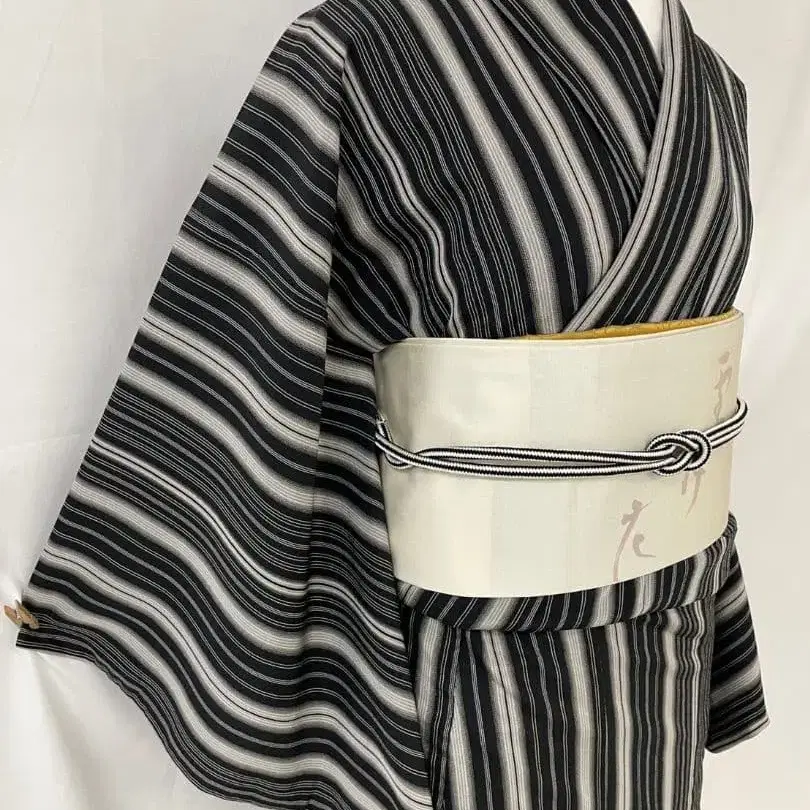 새상품급 순수 실크 이중 기모노 줄무늬 모노톤 오쇼쿠 단품