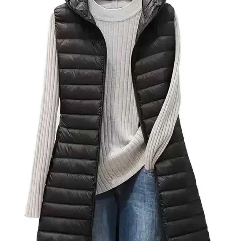 블랙 후드 부착 롱 베스트 경량