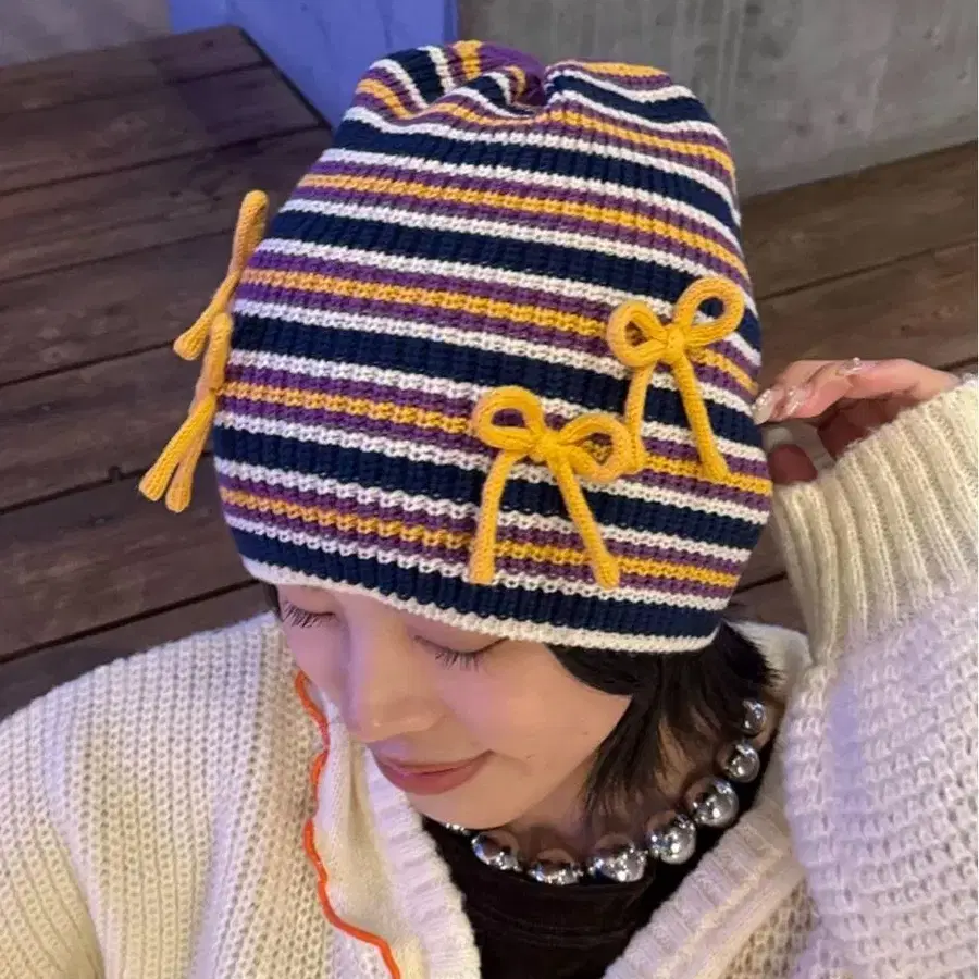 HELLO.SANFRANCISCO 리본 부착 멀티 보더 비니 모자