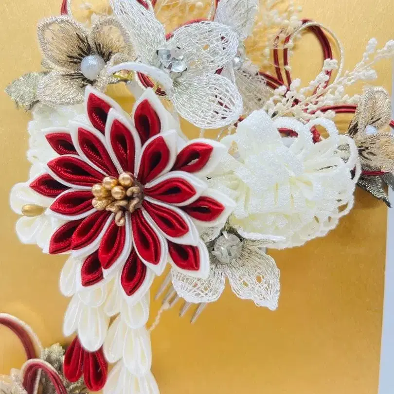 성인식 일본풍 헤어콤 빨흰 꽃 모티브