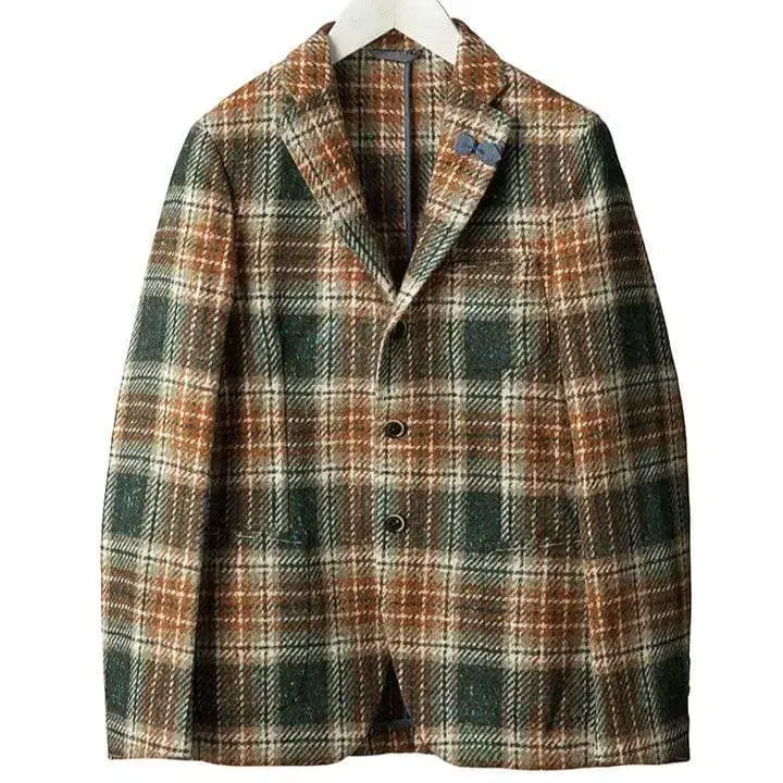 세계적으로 유명한 [JOHN HANLY]사의 네프가 들어간 소프트 트위드 원단으로 체크의 아름다움이 돋보이는 본격적인 테일러드 재킷. 니트 산지로 알려진 아일랜드산 방모사를 사용한 트위드는 홈스펀과 같은 질감이 특징입니다. 퀄리티는 매우 높으며, 착용감, 사이즈, 봉제까지 흠잡을 데 없는 마감이 매력입니다. 캐주얼한 3 패치에 안감 사양은 소매 뒷면만으로 매우 경쾌한 재킷으로 완성되었습니다. 플라워 홀에는 나비 넥타이와 같은 아이콘이 장식되어 있는 것도 포인트입니다. 본격적인 이탈리아제이면서도 가격이 합리적이어서 부담 없이 재킷 스타일을 즐겨보세요.