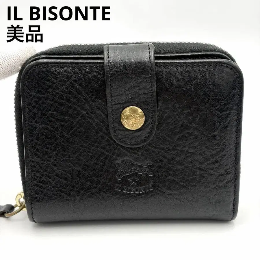 일비종떼 이단 접이식 지갑 라운드 지퍼 블랙 골드 버튼 로고 엠보