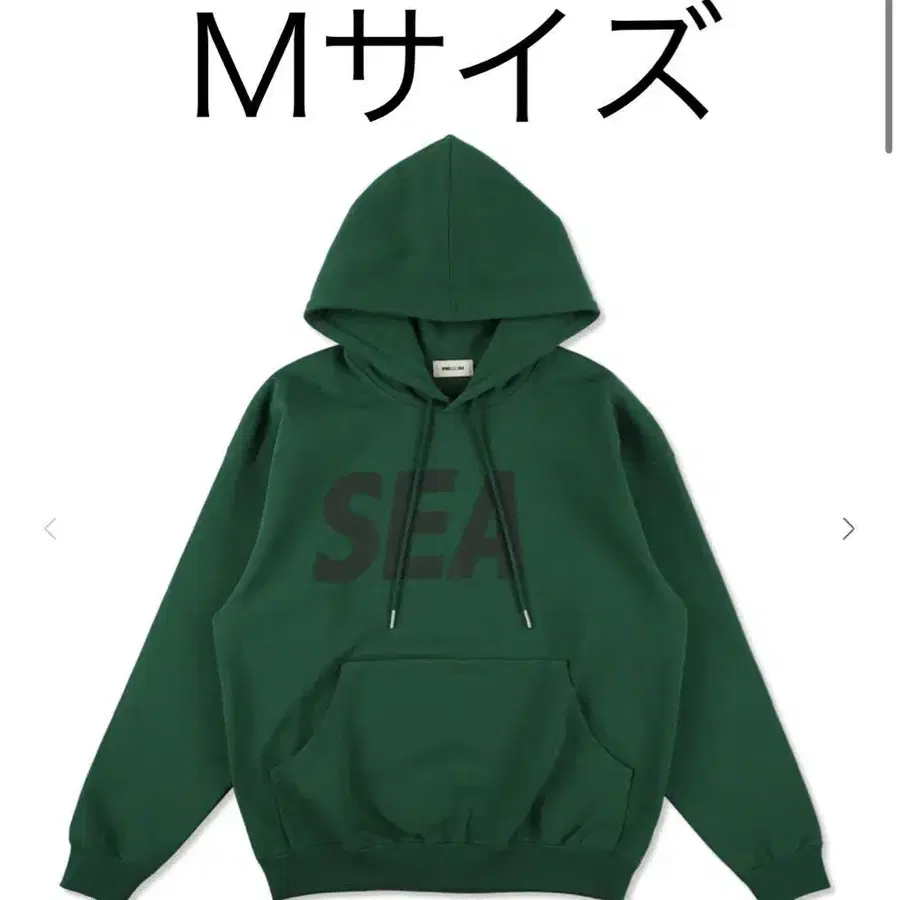 다크 그린 색상의 후드 부착 맨투맨, 프론트에 [ SEA ], 백에 [ WIND AND ] 프린트 디자인.