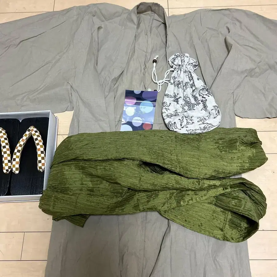 그레이 기모노와 그린 오비, 조리 포함