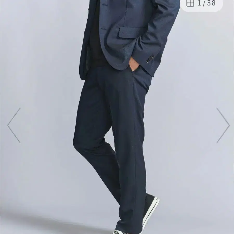 네이비 샴브레이 PE 노플리츠 슬림 슬랙스