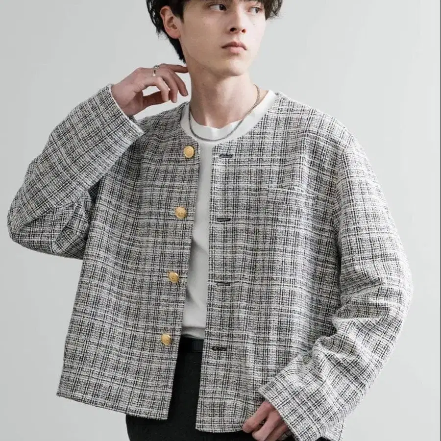 [택 포함 새상품] 체크 라메 트위드 골드 버튼 숏 기장 노카라 자켓