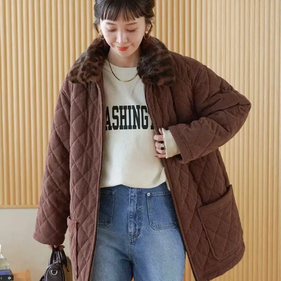 미사용 새상품 브라운 퀼팅 패딩 자켓 퍼 카라 부착
