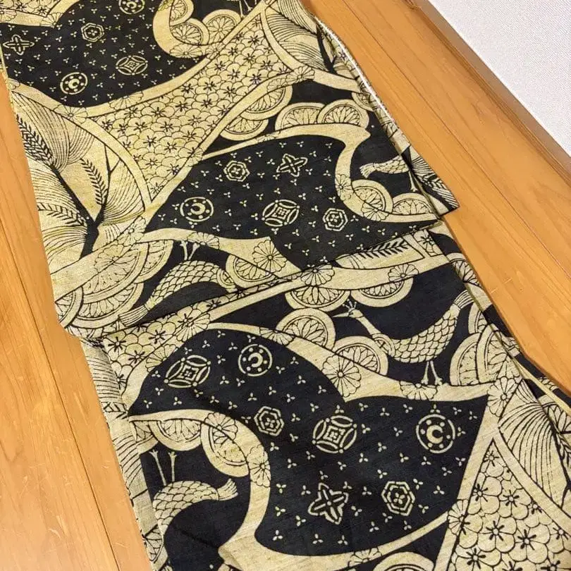 겨자색과 같은 바탕색에 블랙 단색으로 럭셔리하게 무늬가 그려진 코몬입니다. 두 가지 색상만 사용한 배색이지만, 매우 화려한 인상을 줍니다.