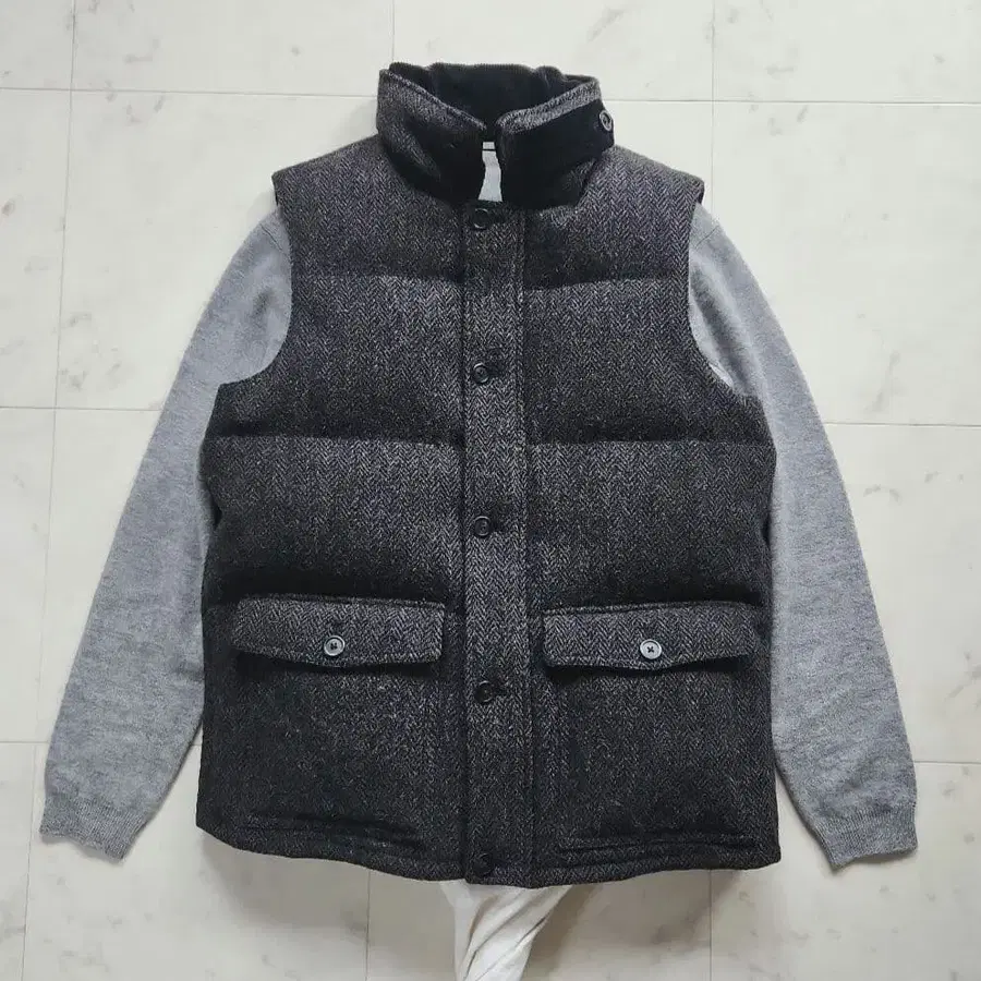 따뜻한 느낌의 해리스 트위드를 사용한 울 소재의 다운 베스트, 세세한 부분까지 신경 쓴 세련된 디자인.