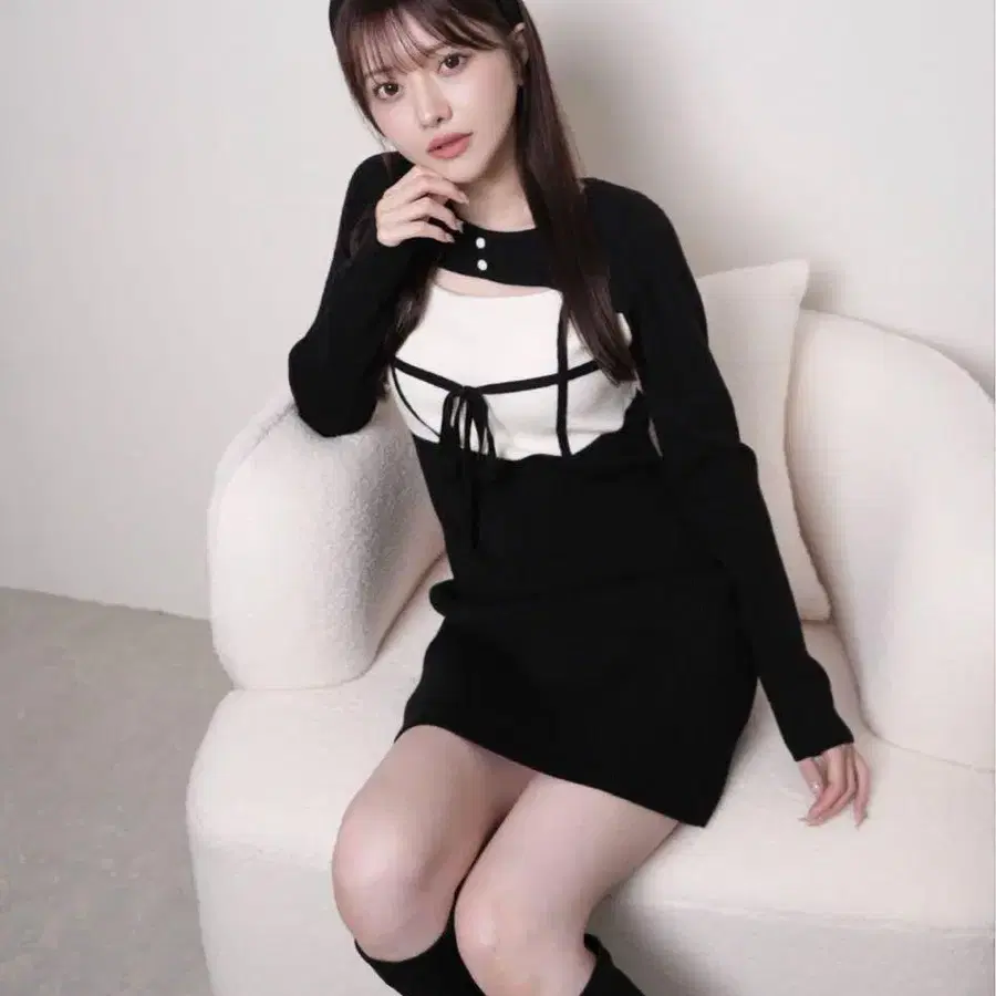 LIPSERVICE 데콜테 오픈 바이컬러 리본 니트 원피스