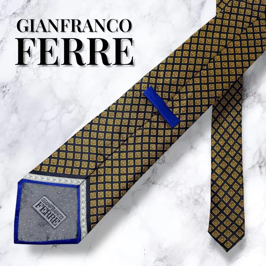 GIANFRANCO FERRE (장프랑코 페레)의 넥타이입니다. 네이비 바탕에 골드 기하학 패턴이 돋보이는 매우 고급스러운 디자인입니다.